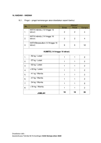16.1.  Pingat – pingat kemenangan akan disediakan seperti berikut: